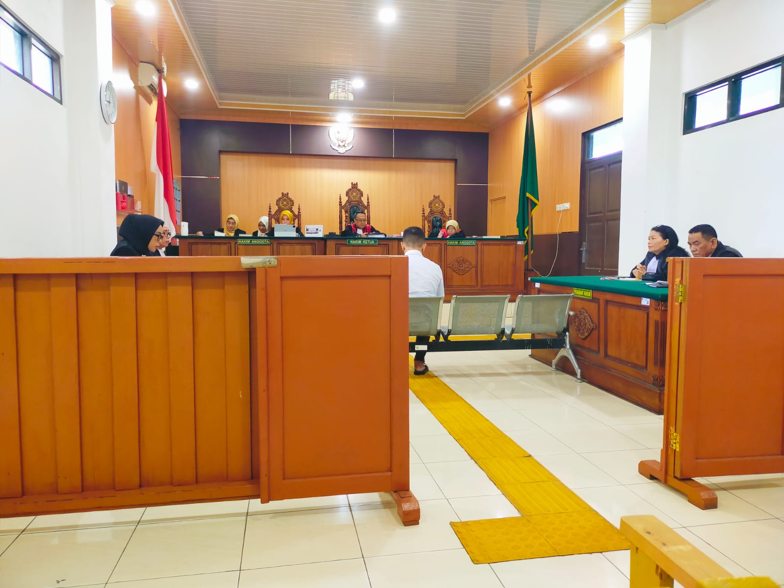 Sidang dipimpin oleh majelis hakim yang diketuai Henddy Belliyaandi. Terdakwa hadir mengenakan kemeja putih dan didampingi penasihat hukum Yohana serta Dani.