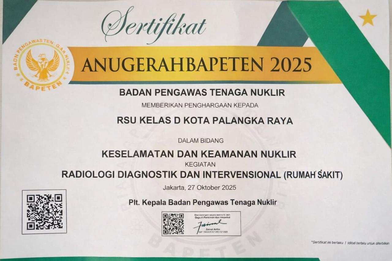 Penghargaan tersebut ditetapkan melalui Keputusan Kepala BAPETEN Nomor 2232 Tahun 2025 dan diserahkan kepada RSUD Palangka Raya sebagai pemegang izin fasilitas radiasi, khususnya dalam kategori Optimisasi Keselamatan Radiasi pada Pasien Radiologi.